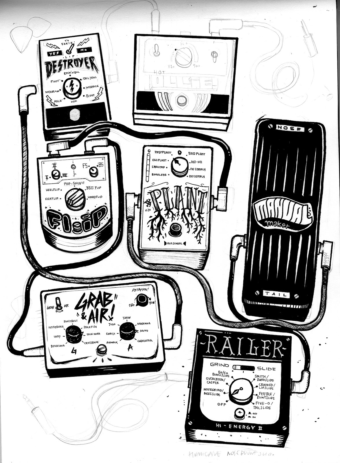 Non sono buono (e neanche sufficientemente nerd) e non mi è mai servito usare troppi pedali per la musica che ho sempre suonato. L'idea di combinare pedali (quindi musica) con lo skate mi è venuta perchè mi sono ricordato di quando andavo in skate e non riuscivo, neanche sforzandomi o facendomi male a chiudere una manovra. Beh, forse un "pedale" mi avrebbe fatto comodo. Niente di che, magari un semplice "boost" o qualcosa che mi avrebbe semplicemente fatto andare più in là di quanto riuscissi a fare da solo. Sì, un pedale mi avrebbe davvero fatto comodo anche se forse nel mio caso sarebbe stato considerato una sorta di "doping". Tralasciando la questione "cheating" e parlando più specificatamente dell'oggetto in questione (ovvero il pedale) e della disciplina delle discipline (lo skateboarding) ci sono un sacco di aspetti che si prestano ad una "fusione" come quella rappresentata nell'illustrazione.